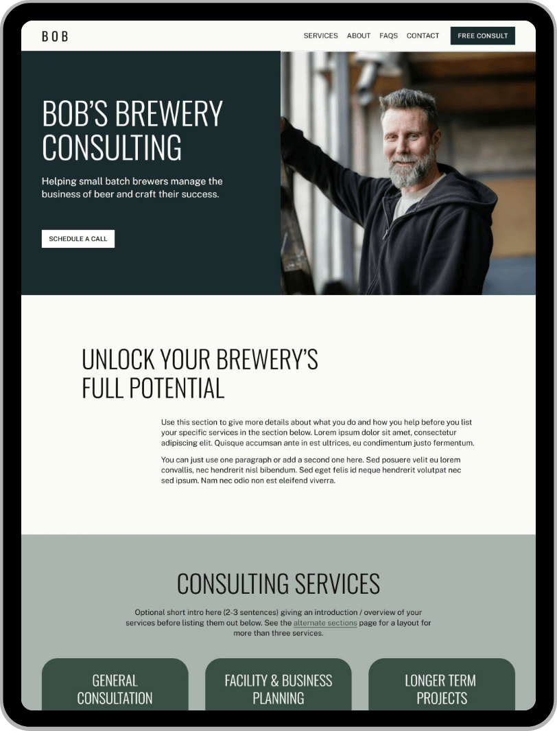 A one page starter website for service-based solopreneurs. The Bob template has everything you need to get a simple services website up and going quickly and it’s designed to be flexible and grow with you as your business grows.