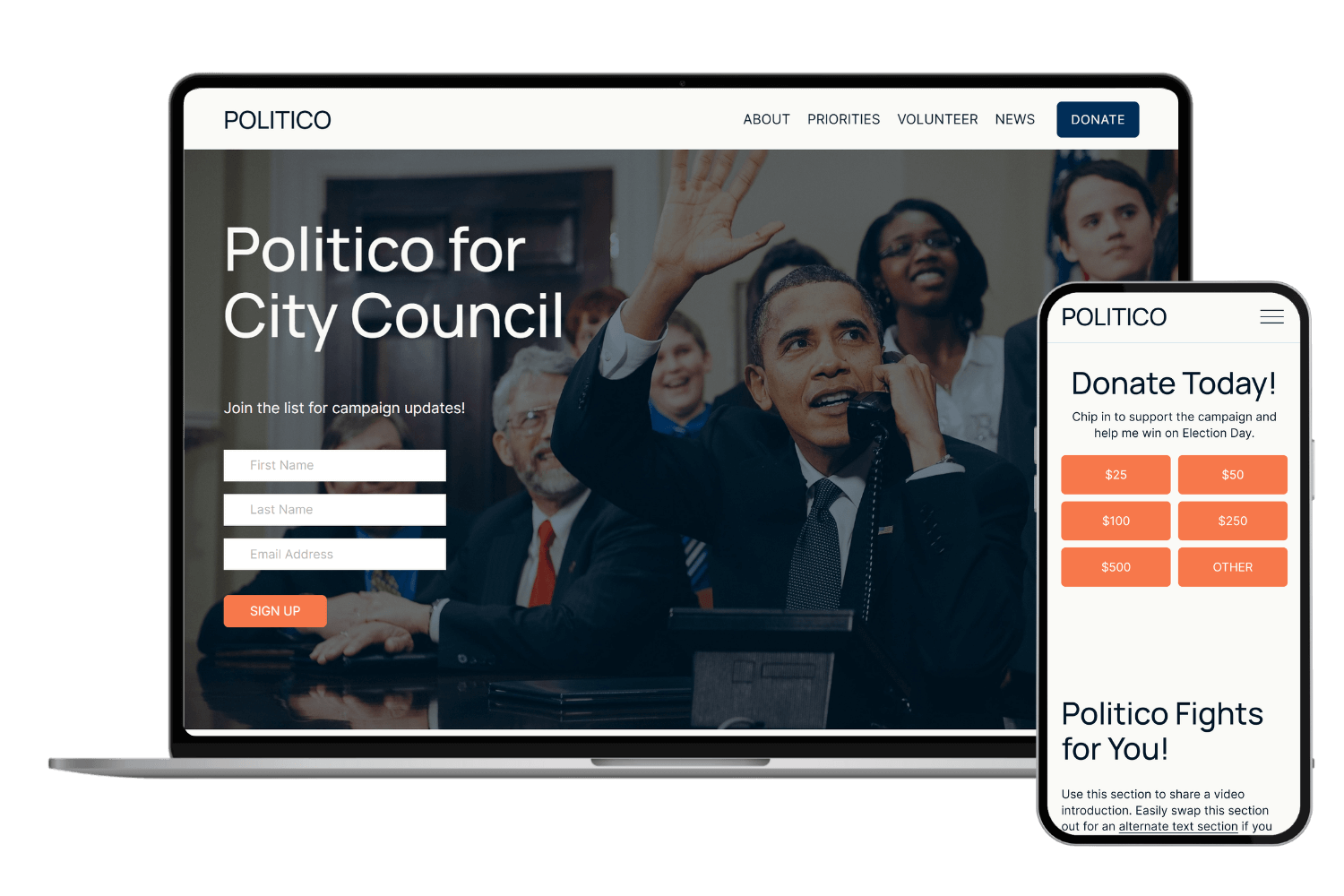 One page website with a flexible design. All of the sections you need for a campaign website and you can easily remove sections and add them back later as your campaign grows.